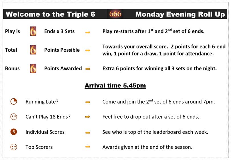Bowls can be played as Singles, Pairs, Triples or Fours. The usual format of games are as follows: